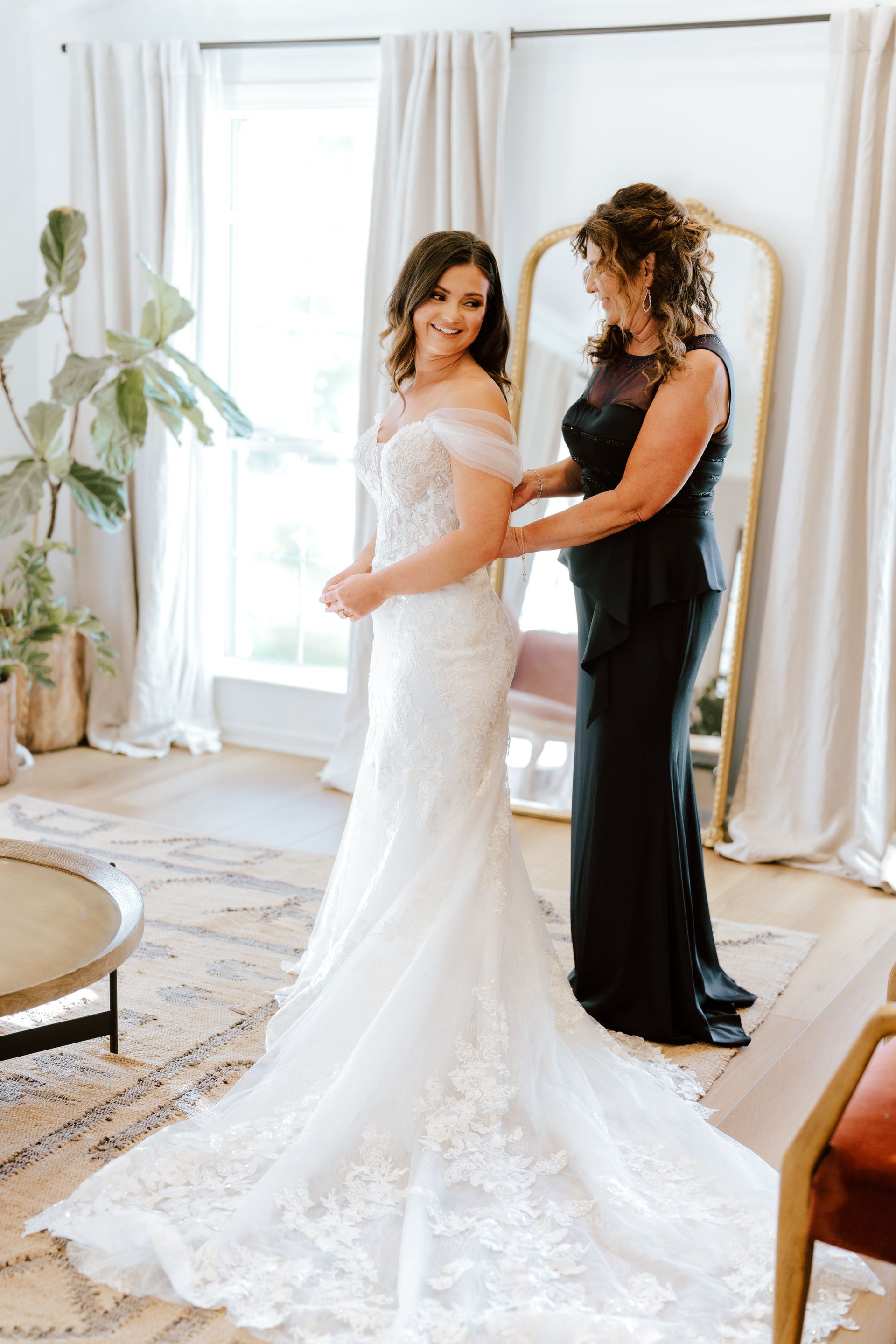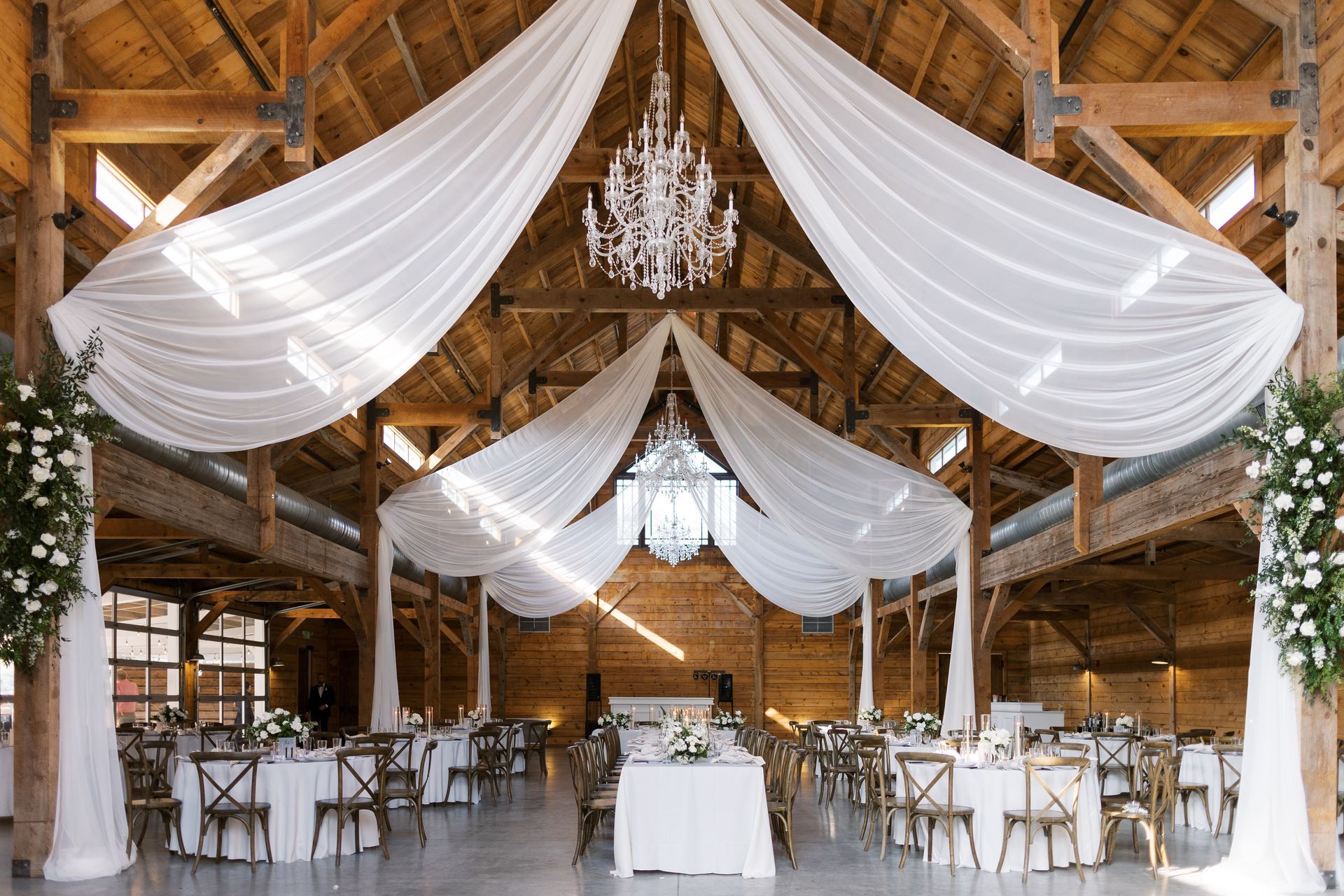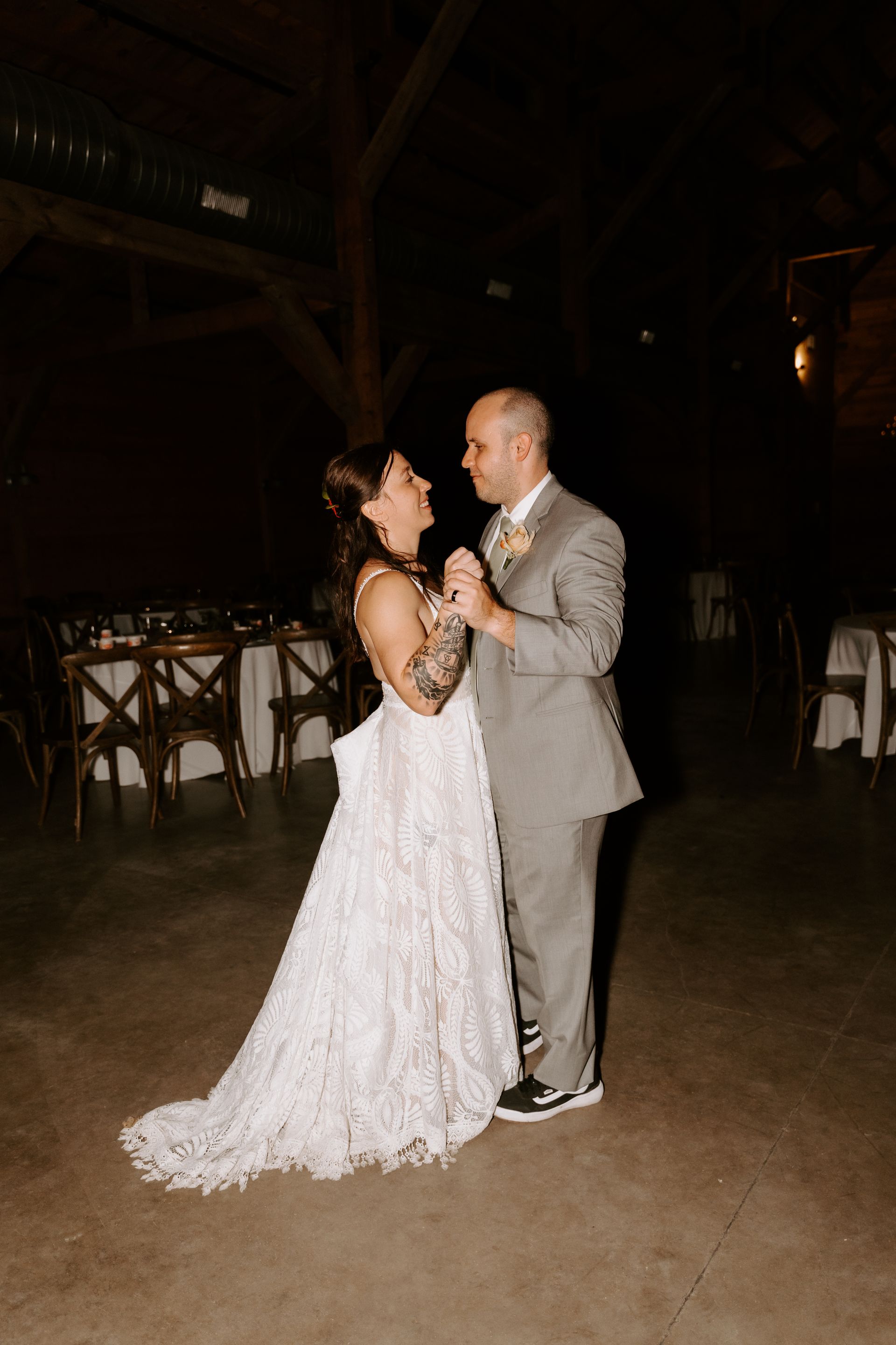 “First of all, the Addison Grove Venue is absolutely stunning, as soon as I visited I knew it was the perfect place for our modern rustic/western fall wedding. The bridal suite is massive with plenty of space to get ready with my girls, tons of appliances to help with lunch and a fridge stocked with drinks and mimosa supplies! There are two gorgeous options for our ceremony location, both of which have grand oak trees providing shade and beautiful natural light to shine through. The reception barn is what sold us though… It was stunning with natural lighting, tall ceilings and chandeliers, giving that modern rustic look we were searching for.. it was all amazing!