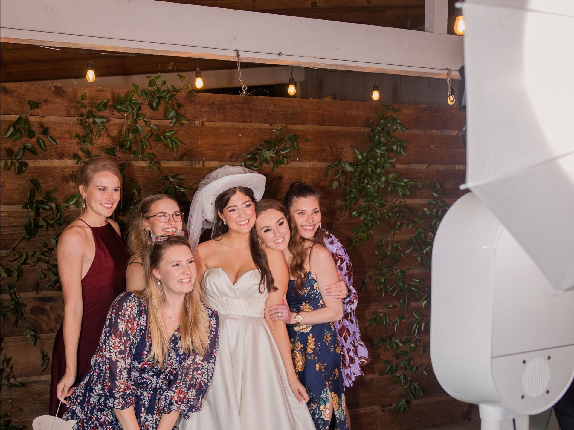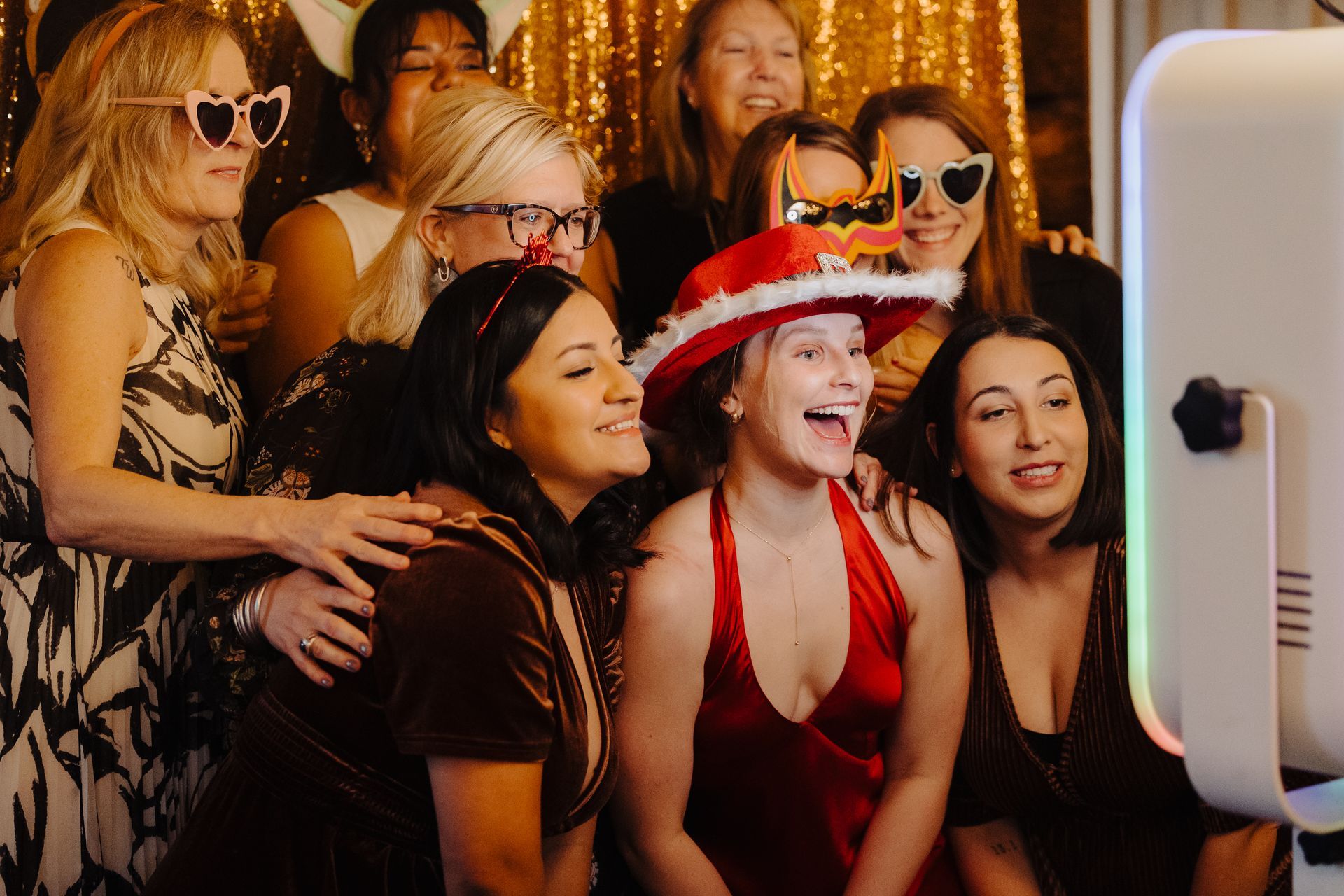 Includes unlimited time and prints, custom branding, LED color customization, live gallery access, customized guest album, neon "Let's Party" sign, and props