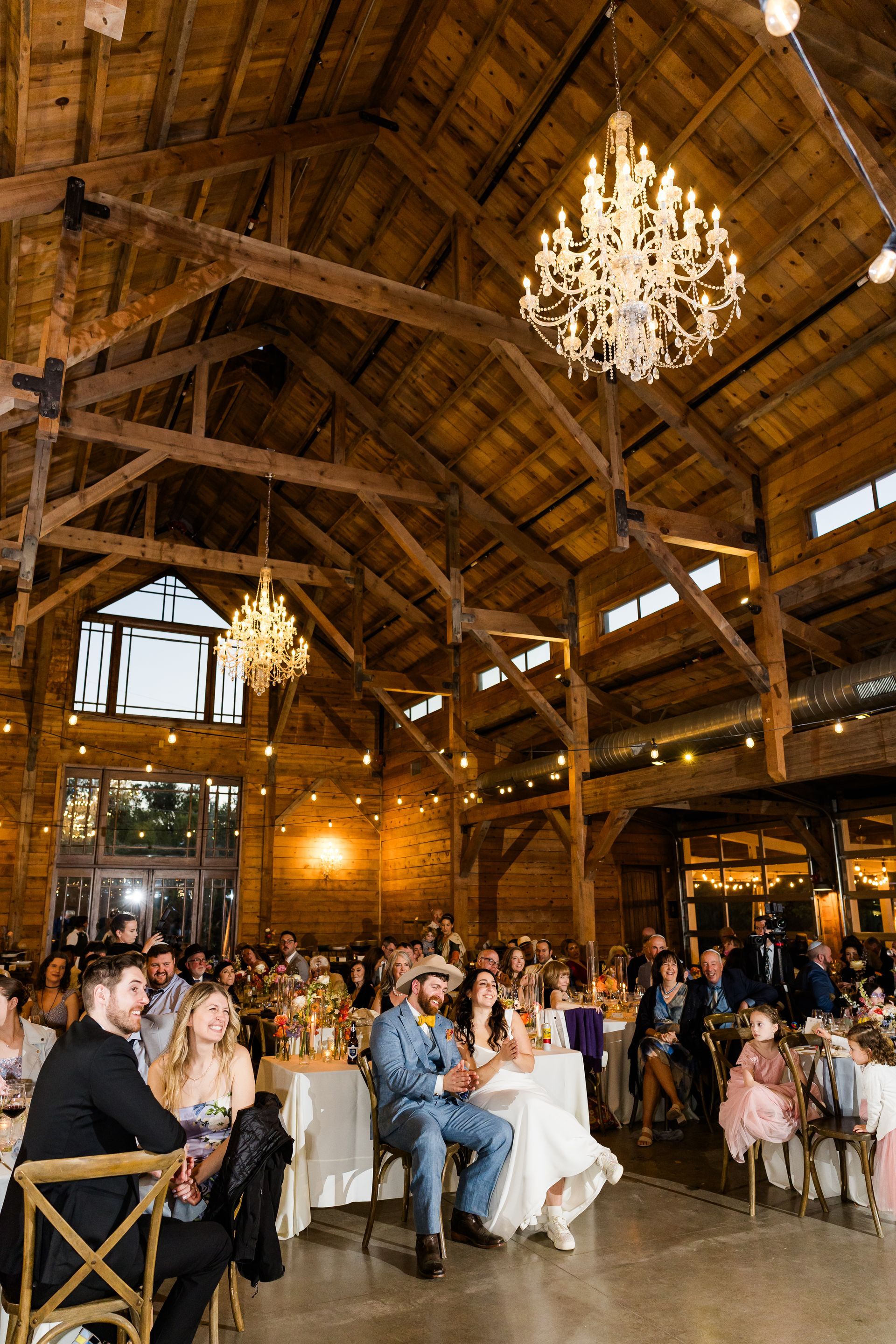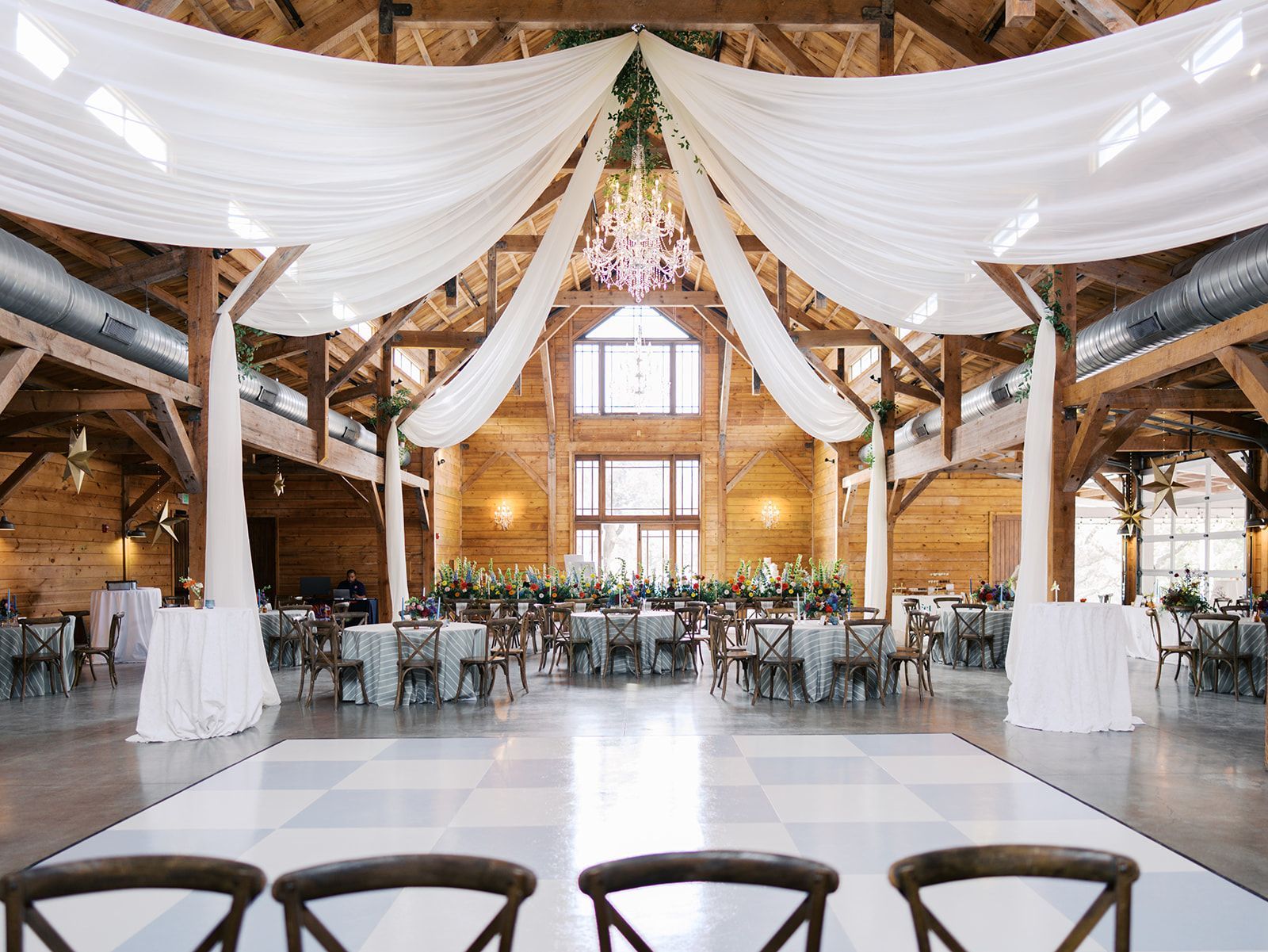 Includes fabric draped at 3 sections and extending where Chandeliers are pre-installed in Barn. Available in off-white, price excludes tax.